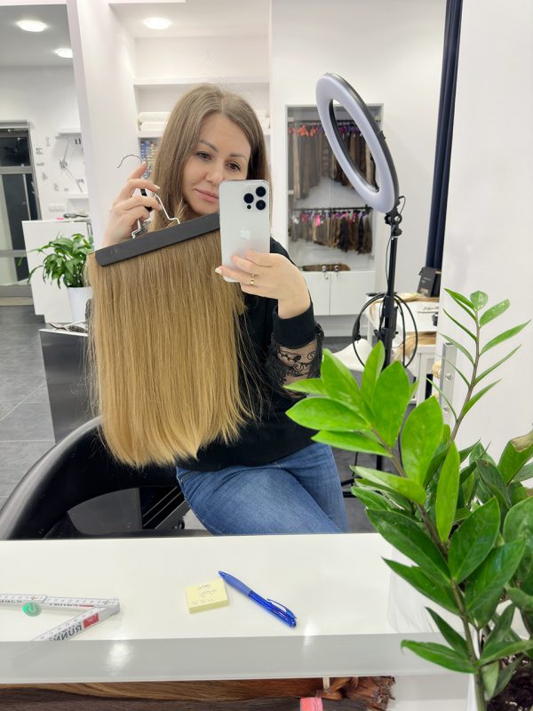 Ręczne szycie taśm do przedłużania włosów do metody Tissage robimy zarówno jak z włosów klienta, tak i z włosów zakupionych u nas w salonie.